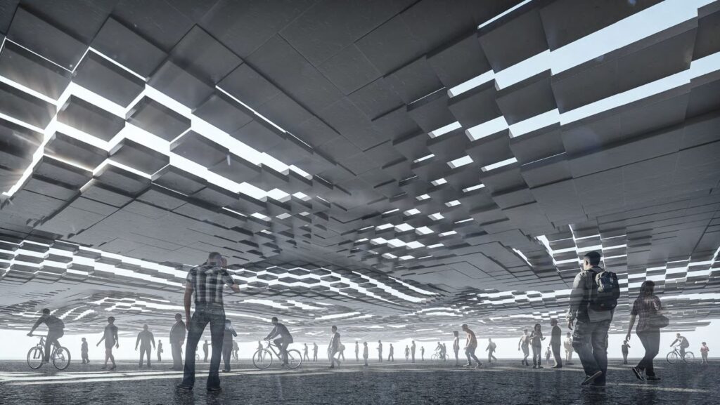 チューリング・パターンを建築空間に導入し、屋根の高低という単純な操作から自発的な形態を生み出す。その生成過程において、人の振る舞いを外乱として取り込み、形態は時々刻々と変化していく。変化した形態は再び人の行為に影響を及ぼし、両者は相互に作用し合いながら、絶え間なく姿を更新し続ける。こうして建築と人とのあいだには、刻々と流転するインタラクティブな関係が紡がれていくのである。