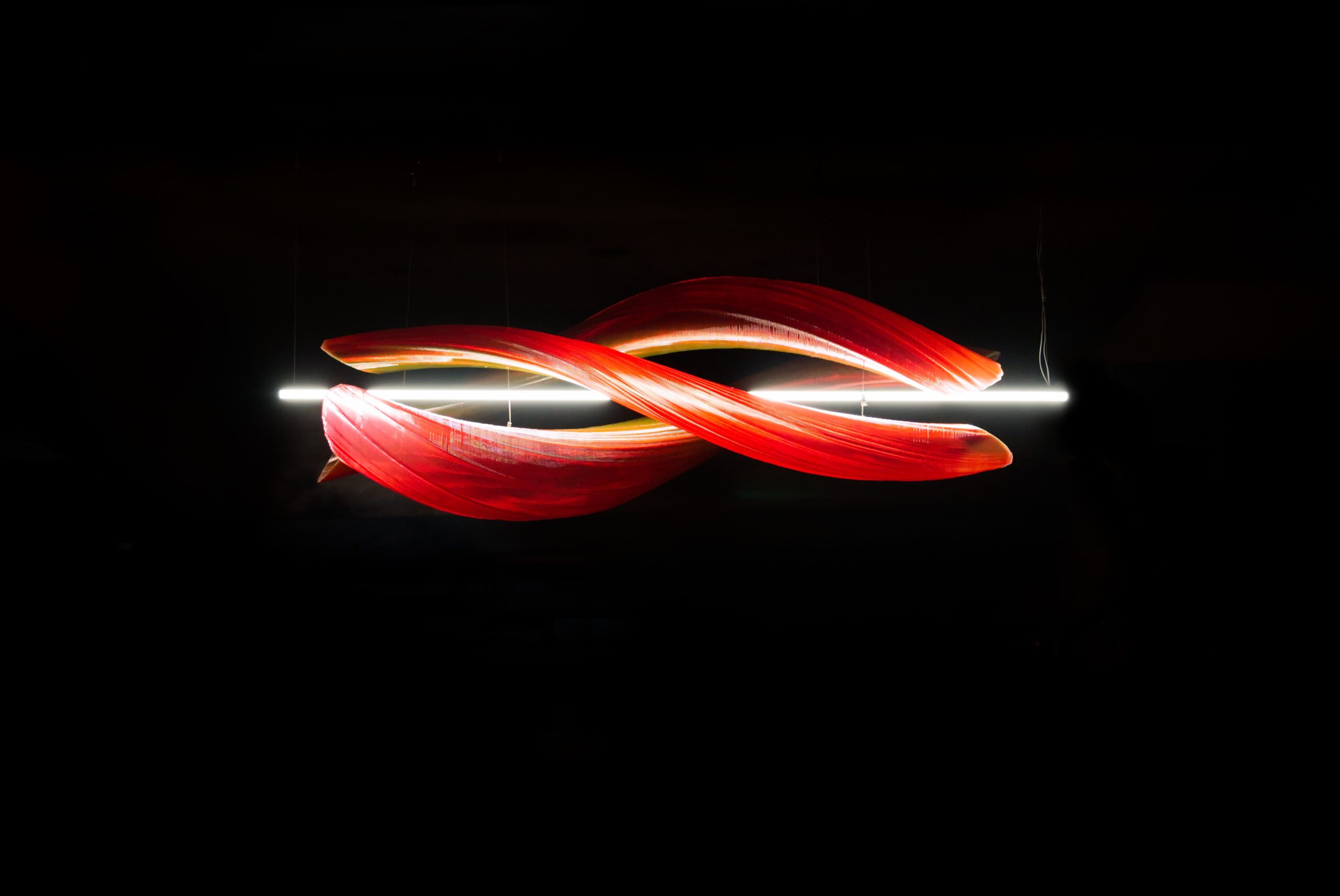 Three twisted lines rise upward, forming a pendant light that seems to entwine with light.